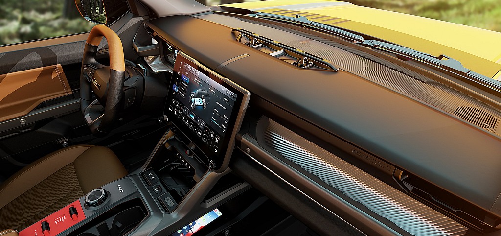 Das Herzstück des Innenraums ist ein ikonisches horizontales Layout, das durch einen markanten Haltegriff auf der Beifahrerseite und ein sauberes, symmetrisches Armaturenbrett verankert wird. Durchdachte Details, wie eine modulare Zubehörschiene auf der Instrumententafel für die Montage von Kameras, Navigationsgeräten oder sogar ein Entenhalter und abriebfeste, wirbelstrukturierte Oberflächen, unterstreichen die Geländegängigkeit und die technische Wertigkeit des Jeep Recon.