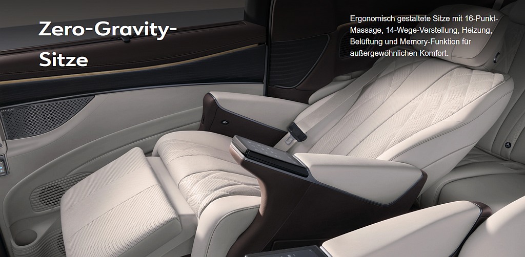 - Die zweite Sitzreihe ist mit sogenannten „Air Spa“-Sitzen in „Zero‑Gravity“-Ausführung ausgestattet – inklusive 152-Grad-‑Liegefunktion, Sitzheizung, Sitzbelüftung, 16‑Punkt‑Massagefunktion sowie integrierten 50‑Watt‑Smartphone‑Ladegeräten